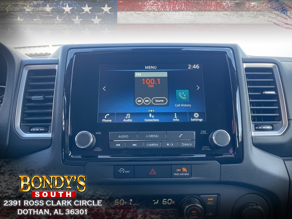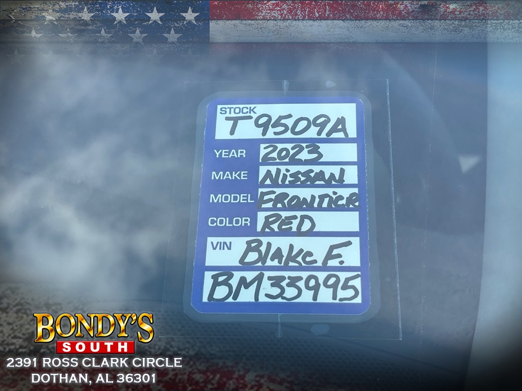 2023 Nissan Frontier SV 120V Power Outlet in Bed, 120V Power Outlet in Rear Center Console, 17'' Alloy Wheels, 3.692 Axle Ratio, 4-Wheel Disc Brakes, 6 Speakers, ABS brakes, Air Conditioning, Alloy wheels, AMFM radio: SiriusXM, Anti-whiplash front head restraints, Apple CarPlayAndroid Auto, Bed Access Package, Bed Under-Rail Lighting, Blind Spot Warning, Brake assist, Bumpers: body-color, Carpeted Floor Mats, Delay-off headlights, Driver door bin, Driver vanity mirror, Dual front impact airbags, Dual front side impact airbags, Electronic Stability Control, Electronic Tailgate Lock, Front anti-roll bar, Front Bucket Seats, Front Center Armrest, Front Halogen Fog Lights, Front reading lights, Front wheel independent suspension, Fully automatic headlights, Heated Front Seats, Heated Leather Steering Wheel, Heated Outside Mirrors, High Beam Assist (HBA), HVAC - Dual-Zone Front Auto AC, I-Key wRequest Switches on OS Handles, Illuminated entry, Illuminated Locking Glove Box, Intelligent Cruise Control, Knee airbag, Lane Departure Warning System, Leather Shift Lever, Low tire pressure warning, Occupant sensing airbag, Overhead airbag, Overhead Console Storage (Sunglass Holder), Panic alarm, Passenger door bin, Passenger vanity mirror, Power door mirrors, Power driver seat, Power steering, Power windows, Premium Cloth Seat Trim, Radio data system, Radio: SXMAMFMAUXUSB Audio System w6 Speakers, Rear anti-roll bar, Rear Automatic Braking (RAB), Rear Cross Traffic Alert (RCTA), Rear seat center armrest, Rear Sonar System, Rear step bumper, Remote Engine Starter, Remote keyless entry, Security system, Sliding Rear Window, Speed control, Speed-sensing steering, Splash Guards, Split folding rear seat, Spray-In Bedliner, Steering wheel mounted audio controls, SV Convenience Package, Tachometer, Technology Package, Tilt steering wheel, Tow Package: Hitch, Tow Harness, TowHaul Mode Switch, Traction control, Trailer Hitch wWiring Harness, Trip computer, Utili-Track System, Variably intermittent wipers, Voltmeter. Cardinal Red Metallic Tricoat RWD